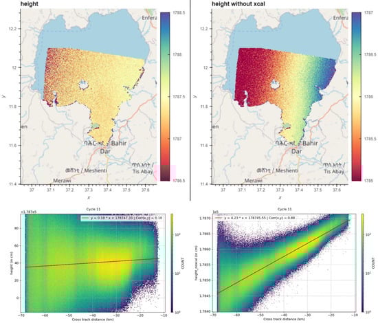 Impact of SWOT’s systematic errors calibration over the Tana Lake (Ethiopia). L2_HR_PIXC product (2 March 2024 cycle 11 pass 471 tile 175L) is used. Height w.r.t cross-track distance are shown with Level-2 calibration (left panel) and without calibration (right panel).