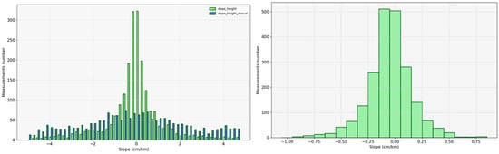 Slope distribution in the cross-track direction with Level-2 (green) and without (blue) the use of the SWOT calibration processing (left panel). Slope differences between Level-2 and Level-3 calibration (right panel).