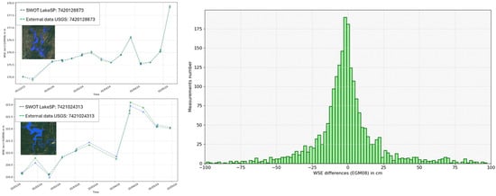 In situ data from Swiss (BAFU Current monitoring data on bodies of water (admin.ch), https://www.bafu.admin.ch/bafu/en/home/topics/water/state/data/current-monitoring-data-on-bodies-of-water.html, accessed on 5 June 2024), and American (USGS Current Water Data for the Nation, https://waterdata.usgs.gov/nwis/rt, accessed on 5 June 2024) lakes networks are used as external reference data. One can mention that in situ data was leveled w.r.t geoid (EGM08) using ICESat-2 ALT13 data (ICESat-2 (nsidc.org), https://nsidc.org/data/icesat-2, accessed on 5 June 2024) to allow absolute comparison for the USGS dataset. SWOT LakeSP and contemporary in situ data are compared (difference less than 1 day). Figure 16 represents the distribution of the differences between in situ and LakeSP data. About 2464 comparisons over 141 lakes (PLD [] reference area higher than 1 km2) have been found. We obtained a residual bias of about 0.3 cm (median value) and a median absolute deviation of 9.9 cm (50% percentile). These comparisons demonstrate the good behavior of the calibration processes, particularly regarding potential bias due to calibration.