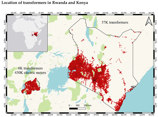 Map showing the location of transformers in Rwanda (left) and Kenya (right).