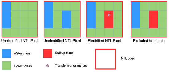 In this section, we discuss our approach to identifying the electrification status of NTL pixels. Electrified pixels in this study refer to pixels that contain built-up structures with access to electricity, while unelectrified pixels are those that either do not contain any built-up structure or contain built-up structures without access to electricity.