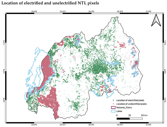Due to the significant spatial resolution mismatch between the NTL images (≈500 m) and the LULC product (10 m), we ensured that the geographic area covered by each unelectrified NTL pixel was entirely covered by either the water or forest class in the LULC product. In Figure 3, we provide an illustration of the selection of electrified and unelectrified NTL pixels based on the description above. Lastly, Figure 4 shows the spatial distribution of the electrified and unelectrified pixels in Rwanda. As expected, we observe that the majority of the unelectrified locations are clustered around the national parks [56] and lakes [57], especially around Lake Kivu and Nyungwe National Park in the west of the country.