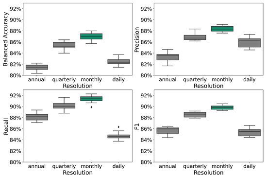 Boxplots showing the distributions of the performance of the electrification models developed from annual, quarterly, monthly, and daily nightlight composites with 10-fold cross-validation. Notice that monthly composites (highlighted in green) outperform all other composites across the four metrics.