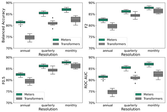 Figure 6 presents a comparison of the model’s performance when identifying electrified pixels based on transformer locations versus meter locations. Because of the difference in the number of pixels identified as electrified with meters and transformer locations, in this section, we use performance metrics that are less sensitive to data imbalance such as balanced accuracy, Area Under the Curve of the Receiver Operating Characteristic curve (AUC ROC), and scores thereby enabling a more comprehensive evaluation of the model’s performance. The appendix contains the results of the other six metrics.