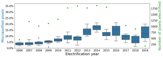 Time series boxplots showing the percentage of misclassified pixels as a function of the year the pixels were electrified. The secondary y-axis shows the total number of pixels electrified in each year while each boxplot shows the distribution of the 10-fold cross-validation result.