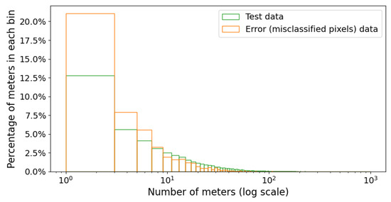Distribution of the counts of meters in the test and error data. The x-axis is in log scale due to the wide range of meters in the pixels. Notice that the percentage of meters in the first three bins is significantly less in the test data than in the error data.