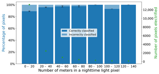 Here, we delve into the relationship between the number of meters within a pixel and its likelihood of being accurately classified as electrified. Our analysis reveals an interesting pattern in the distribution of meters in the full test data and the data containing only misclassified electrified pixels. In Figure 8, we observe a more right-skewed distribution of meters in the test data compared to the error data (misclassified pixels) indicating that pixels with fewer meters are more likely to be misclassified. This is also depicted in Figure 9 where we show that the percentage of correctly classified electrified pixels increases as the number of meters in a pixel increases. It is worth highlighting that no electrified pixel with more than 140 m was misclassified as unelectrified in this study.