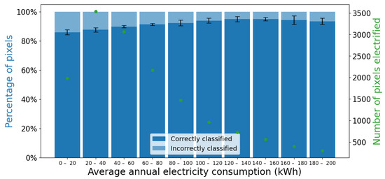 In this section, we examine the relationship between the electricity consumption within a pixel and its detectability. The electricity consumption in a pixel is calculated as the sum of the average annual electricity consumption across all meters within that pixel. In line with the findings observed with the number of meters in a pixel, our analysis reveals a comparable pattern when considering the annual electricity purchases of pixels. Figure 10 demonstrates that pixels with higher annual electricity purchases exhibit a lower likelihood of misclassification. Interestingly, we observe a steady increase in accuracy up to the 120–140 kWh consumption bin, after which it plateaus. This plateau may suggest that beyond a certain threshold, further increases in electricity consumption no longer correlate strongly with outdoor lighting, which is primarily captured by NTL imagery [34]. It is likely that after the initial few kWh, electricity is increasingly used for indoor activities rather than outdoor lighting, leading to a diminishing correlation between electricity consumption and NTL radiance. However, it is important to note that there are fewer pixels consuming more than 120 kWh per year, resulting in higher variance in error rates for these higher consumption bins due to the smaller sample size.