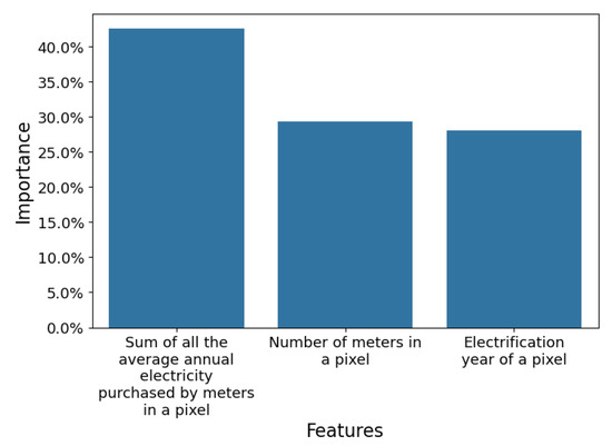 Next, we assess the importance of each of the features with the Mean Decrease in Impurity (MDI) and the Drop-Column feature importance techniques. MDI technique measures the importance of features by evaluating how it reduces impurity during tree splits. The impurity reduction is calculated for each split for each feature and then averaged over all trees in the random forest model [71]. The Drop-Column technique involves first establishing a baseline performance with all the features and subsequently excluding a feature, retraining the model, and then recalculating the performance of the model. The importance of a feature is determined by the difference between the baseline score and the score obtained when that feature was excluded [72]. Both methods identified the total average annual electricity purchased of all meters in each pixel as the most important of the features that determine the correct classification of an electrified pixel. The result of the MDI technique is shown in Figure 11.