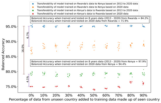 In this section, we provide the result of the generalization of the model trained on one country to the other. Figure A6 shows the accuracy, balanced accuracy, sensitivity, specificity, and precision while Figure A7 shows the F1, F0.5, F2, AUC-ROC and MCC. We observe that the models’ performance scores do not show significant improvement when additional data from the test location are incorporated into the training data.