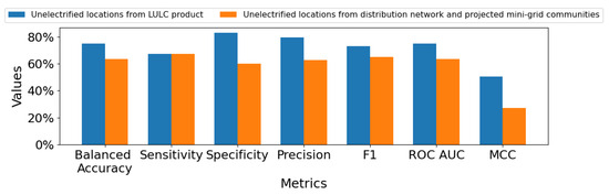 Figure A5 below compares the performance of the electrification mapping model when employing meter locations versus transformer locations to identify electrified NTL pixels across all 10 metrics. Identifying electrified NTL pixels with meter location gave the best performance across all metrics except Specificity.