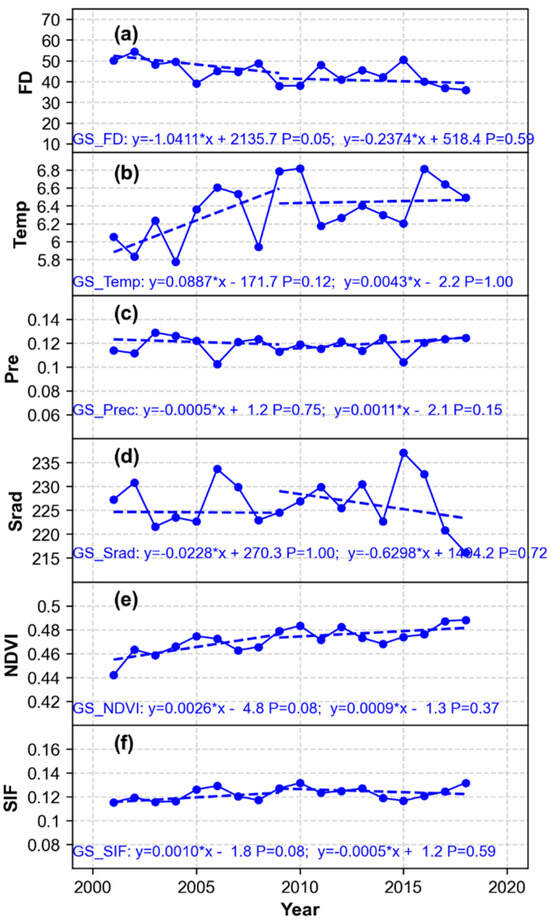 Seasonal trends of environmental factors and vegetation changes for each grid cell in the Third Pole during the period of 2001–2018: (a) frost days (FDs); (b) temperature (Temp); (c) precipitation (Pre); (d) short radiation (Srad); (e) NDVI; (f) GOSIF.