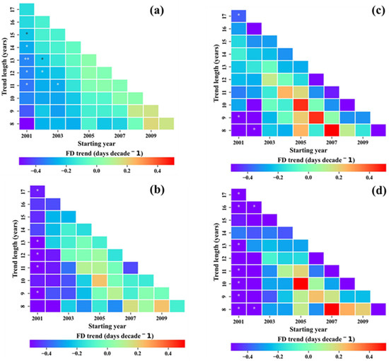 Examining different research periods led to different results that could not be directly verified and compared to each other; thus, comparative analysis could not be performed among multiple periods. Figure 4 shows the temporal trends in FDs during the growing season and seasonal scales in the Third Pole during periods of different lengths starting between 2000 and 2018. Overall, the FDs at the growing season and seasonal scales had no significant decreasing trends in the Third Pole from 2001 to 2018. Specially, the trend values of SPR_FDs, SUM_FDs, FAL_FDs, and GS_FDs at different research periods ranged from −0.4 to 0.4, and most of these values were less than 0, which means that the FDs at the growing season and seasonal scales in different study periods showed insignificant decreasing trends in Figure 4a–d. The FD trends during the periods of 2005–2015, 2006–2015, and 2007–2015 exhibited statistically insignificant increasing patterns. Conversely, the FD trends for the two intervals commencing in 2001 and 2002 demonstrated a rapid decline, with a considerable number of periods passing the significance test. The FAL_FDs trend was close to that of the GS_FDs and decreased by a similar magnitude. Overall, decreasing trends of FDs were found in the Third Pole from 2001 to 2018, which were generally consistent with the results of previous studies and helped clarify FD trends during different research periods.