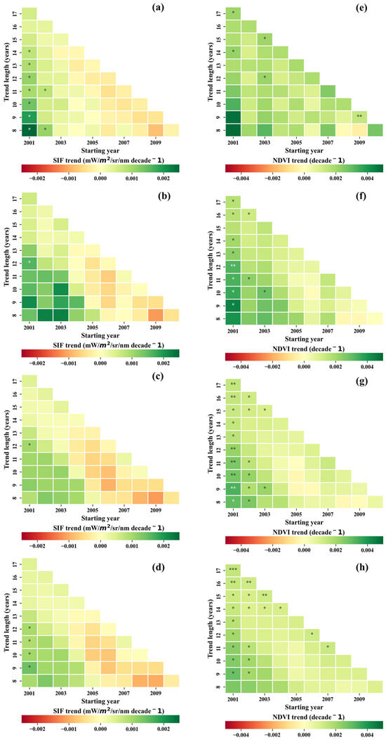 Temporal trends in average GOSIF and NDVI values over the Third Pole were analyzed for periods of different lengths (≥8 years) and starting years: (a,e) spring trends; (b,f) summer trends; (c,g) autumn trends, (d,h) the growing season trends. For each starting year, trends were examined over periods with a minimum duration of 8 years. For instance, trends for the 2001 starting year were evaluated for periods ending between 2008 and 2018, while for 2009, trends were assessed for periods ending in 2016, 2017, and 2018. The Mann–Kendall trend test was used for each period. Positive trends reflect increasing GOSIF and NDVI values, while negative trends indicate decreases. * (p < 0.05), ** (p < 0.01) and *** (p < 0.001) denote statistical significance.