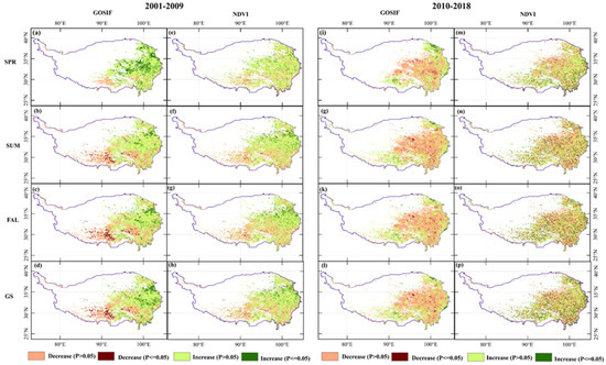 Spatial distributions of the trends in the average GOSIF and NDVI values from 2001 to 2018 in the Third Pole: (a–h) the trends of seasonal GOSIF and NDVI values over the period of 2001–2009, respectively; (i–p) the trends of the seasonal GOSIF and NDVI values over the period of 2010–2018, respectively. The seasonal cycles used in GOSIF and NDVI calculation correspond to those used in frost estimation.
