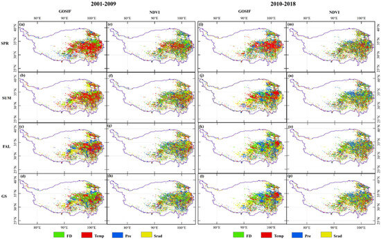 To identify which environmental factors control alpine vegetation, we further compared the absolute values of these correlation coefficients for each pixel, reclassified four groups, and obtained the spatial distribution of the controlling factors in the growing season in the Third Pole from 2001 to 2018, as shown in Figure 10. Overall, large spatial heterogeneity existed in the temporal evolution of controlling factors. The discrepancies in controlling factors among the different vegetation datasets mainly resulted from the differences in the data. Most of the central plateau was mainly controlled by temperature, which was most obvious in spring. The northern Qinghai Plateau was controlled by frost days, which was most significant in the growing season, according to the trends and magnitudes of the frost days from 2001 to 2018. The southwest and northeast regions of the plateau were affected by radiation. The contribution of precipitation was more obvious in the period of 2010–2018 according to its distribution, but there was no regularity in the period of 2001–2009, indicating a positive influence on the sensitivity of vegetation growth to precipitation. Furthermore, the GOSIF values had a higher correlation with environmental factors, and the contribution of each environmental factor in each season over the whole region was regularly distributed.