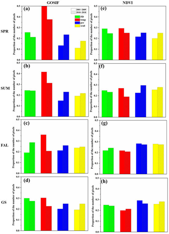 Proportions of pixels with contribution factors in the Third Pole from 2001 to 2018. The solid bars indicate the period of 2001–2009 (a–d). The bars with diagonal lines indicate the period of 2010–2018 (e–h). Different environmental factors are as follows: FDs: frost days; Temp: air temperature; Pre: precipitation; Srad: shortwave radiation.