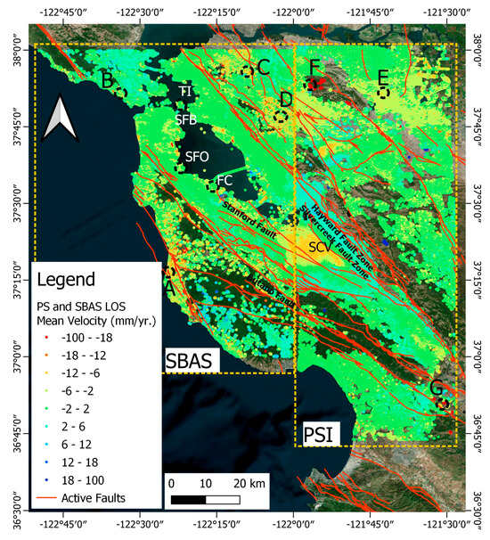 - Bürgmann, R.; Hilley, G.; Ferretti, A.; Novali, F. Resolving Vertical Tectonics in the San Francisco Bay Area from Permanent Scatterer InSAR and GPS Analysis. Geology 2006, 34, 221–224. [Google Scholar] [CrossRef]
