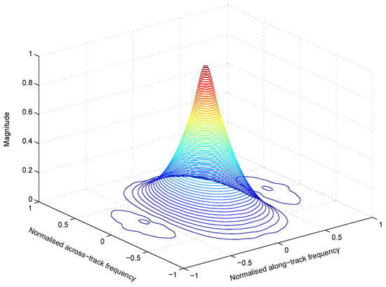 Since the pioneering very high resolution (VHR) imager IKONOS-2, launched in 1999, MS scanners onboard satellites have attained submetric resolutions in the VNIR wavelengths of the Pan image. The present generation of WorldView satellites for EO features extremely high resolution (EHR) acquisition capability: up to 1.24 m for MS and 0.31 m for Pan, at nadir. The resolution capability of less than one meter from an orbit of heights greater than 600 km is obtained thanks to extremely cumbersome and heavy optics. Constraints in the system design have motivated the adoption of a unique optics for both the MS and Pan scanners. MS bands have a lower spatial resolution, and are acquired with a somewhat elevated value of the modulation transfer function (MTF) at Nyquist frequency (half the sampling frequency). Conversely, the Pan image, typically having four times greater Nyquist frequency, for an MS-to-Pan scale ratio equal to four, is captured with a lower MTF value at Nyquist, but a higher SNR, thanks to the time-delayed integration (TDI), directly implemented on the charge coupled device (CCD). The on-orbit Pan image, being only a little noisy and practically aliasing-free, is then postprocessed for restoration of the MTF to a value similar to those of the MS bands. An edge-crispening filter, i.e., an all-pass filter plus a high-pass filter, is usually applied during the geocoding process, which includes a resampling. The characteristics of the MTF, with shape of a Chinese hat with broad flaps, produces typical values at Nyquist frequency around 0.3 for the MS channels, and less than 0.1, on orbit, for the Pan. Figure 1 illustrates the laboratory MTF of an MS channel of the Pléiades instrument. Note that the spatial frequency response is squeezed along track due to the motion of the platform []. Due to diffraction of the optics, the MTF is slightly shrunk as the wavelength increases. Thus, the spatial resolution is slightly better for the leftmost part of the visible spectrum, corresponding to the violet color [].