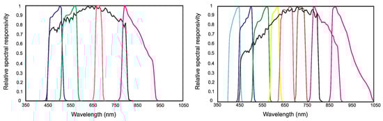 Spectral responsivity functions of: (left) GeoEye-1, bands: blue, Pan, green, red, NIR. Left to right; (right) WorldView-2, bands coastal, blue, Pan, green, yellow, red edge, NIR1, NIR2, with one MS scanner (MS1) taking the same four bands as GeoEye-1; another MS scanner (MS2) capturing coastal, yellow, red edge and NIR2.