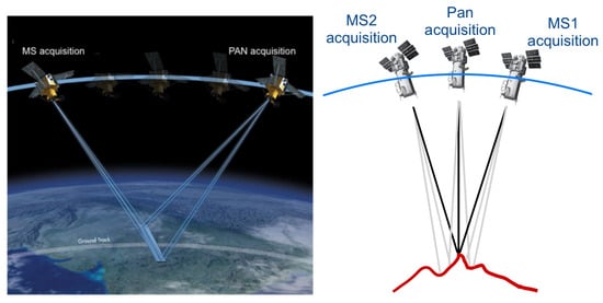 The situation described before is even more complicated for satellites equipped with more than two instruments, such as the WorldView-2/3 platforms, in which eight MS bands are taken by two separate instruments. In WorldView-2, three instruments are present on the platform: the classical 4-band MS instrument (MS1), and the new MS instrument (MS2) featuring four more bands, partially interleaved with the others. WorldView-3 is also equipped with a short-wave infra-red (SWIR) scanner. Now, the three instruments acquire different areas at the same instant, or equivalently, they scan the same area at different times. Consequently, moving objects and points at different heights in the scene appear not only shifted in the two sets of MS bands towards the Pan images [], but the two sets of MS bands are also captured at different moments from distinct positions along the orbit; hence, under different viewing perspectives. Figure 3, right panel, illustrates the acquisition geometry of the WorldView-2 platform. For the sake of clarity, the angles between the optical axes have been intentionally exaggerated.