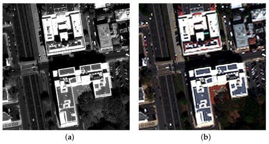 Figure 5 presents the residue of the multivariate regression of the four MS bands towards the lowpass-filtered Pan, both before and after the four bands have been corrected, as in Equation (3). The residue is mostly concentrated on the top of buildings, whose height is presumably unspecified in the available DEM used for the geometric corrections. After correction, the coefficient of determination of the multivariate regression increases from to .
