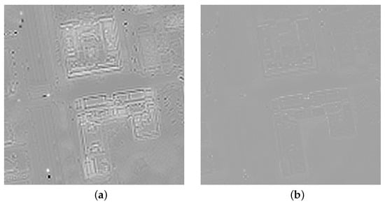 Residue of multivariate regression to lowpass-filtered Pan of: (a) resampled MS bands, ; (b) corrected MS bands, .