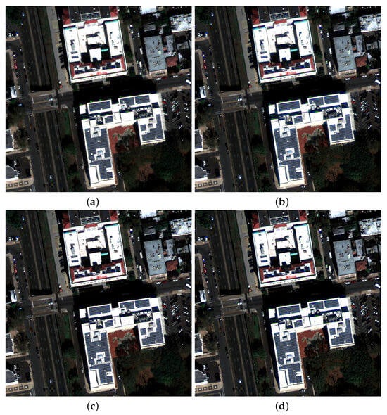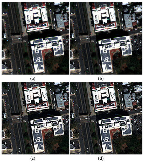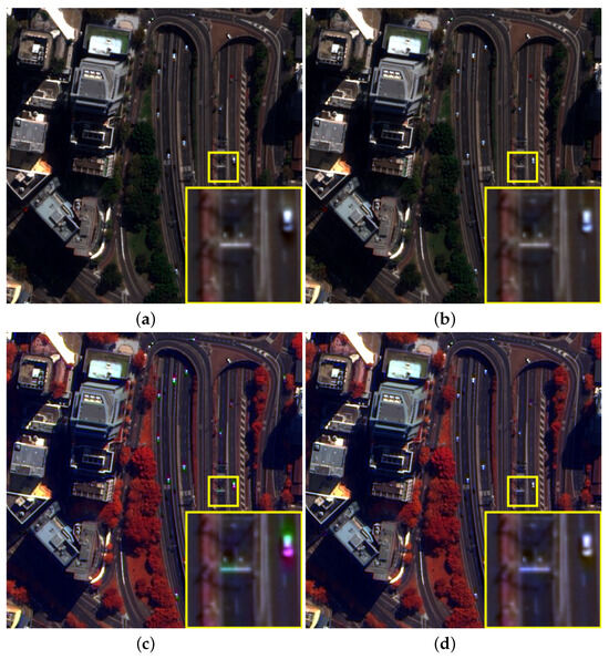 Visual results of fusion with correction for MS-to-Pan alignment: (a) BT-H with alignment; (b) GSA with alignment; (c) AWLP-H with alignment; (d) MTF-GLP-FS with alignment.