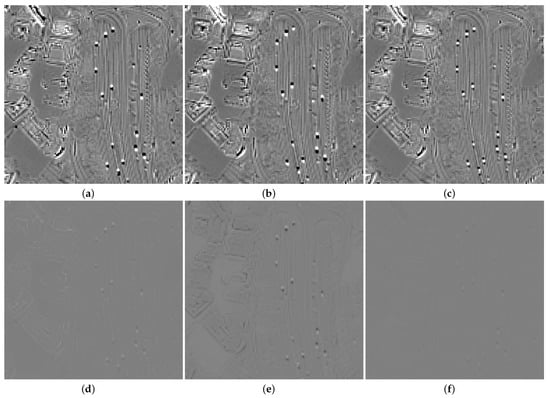 Residue of multivariate regression to lowpass-filtered Pan of: (a) the four bands of MS1, ; (b) the four bands of MS2, ; (c) the eight bands together (MS1 + MS2), ; (d) the corrected bands of MS1, ; (e) the corrected bands of MS2, ; (f) MS1+MS2 after correction, . All residue maps have been linearly stretched by the same factor for displaying convenience.
