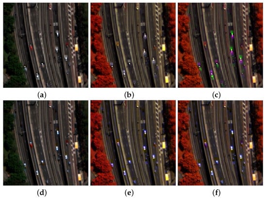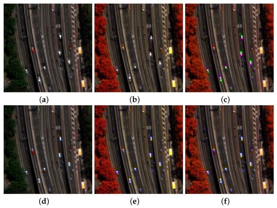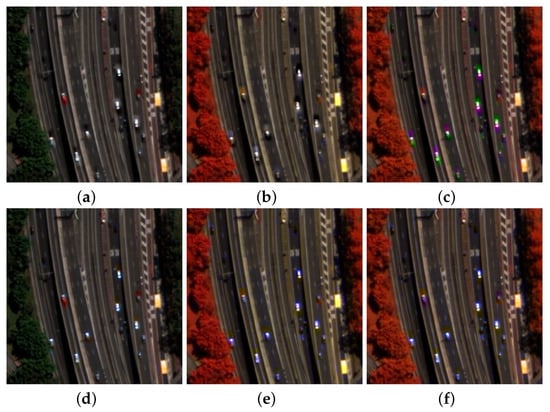 Visual results of MTF-GLP-FS fusion with and without correction for MS-to-Pan alignment: (a) 5-3-2 composition (R-G-B true color captured by MS1) without alignment; (b) 6-4-1 composition (RE-Y-C false color captured by MS2) without alignment; (c) 6-3-1 composition (RE-G-C false color captured by MS1 and MS2 together) without alignment; (d) 5-3-2 composition (R-G-B true color captured by MS1) with alignment; (e) 6-4-1 composition (RE-Y-C false color captured by MS2) with alignment; (f) 6-3-1 composition (RE-G-C false color captured by MS1 and MS2 together) with alignment.