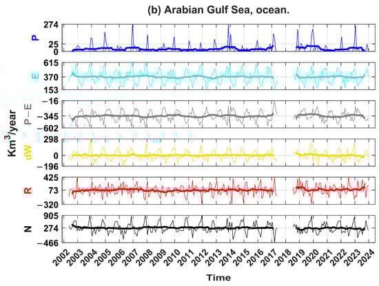 The ocean water flux, N, will be estimated in a two-step process following the approach in []. First, knowing P, E, and dW in the continental catchment region draining to the Arabian Gulf, the corresponding R can be estimated as a residual in Equation (1). Second, knowing P, E, dW, and R (estimated in the previous step) in the Arabian Gulf, the corresponding N can be estimated as a residual in Equation (2).
