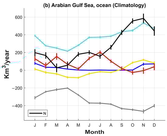 Annual climatology (monthly averages) of signals shown in Figure 2. The error bar of each month is 1 standard deviation of the mean. (a) Continental drainage basin and (b) Arabian Gulf Sea.