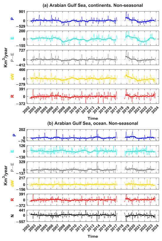 The large values of E relative to P result in net evaporation during all months of the year. The intra-annual variation of P−E is mainly produced by E, as indicated by the high correlation (–0.89 ± 0.01, Figure 5a) between the original time series. Contrary to what might appear to be the case, dW follows a reverse annual cycle to that of P−E. Net evaporation is lowest in April (–202 ± 8 km3/year), but dW reaches its second largest value in absolute value (among the negative values) that month (–80 ± 12 km3/year, and –85 ± 11 km3/year in May). On the other hand, the highest P−E water loss occurs in November (–465 ± 23 km3/year), when the increase in water mass budget peaks (117 ± 11 km3/year). This opposite behavior is reflected in the negative correlation of the original series of dW and P−E (−0.45 ± 0.04), and the positive one between dW and E (0.57 ± 0.04). This is possible thanks to the inflow of water from the continent, but above all thanks to the inflow of water from the Indian Ocean through the Strait of Hormuz. The original time series of dW and N display a high positive correlation of 0.69± 0.03, which means that the deficit of water produced by E (and then P−E) is overcompensated by N, which ultimately drives the intra-annual variability of dW. It is important to note that the original series of R and N have a high negative correlation, −0.77 ± 0.03. This means that when there is a large contribution from R, N is reduced, as in March, when R = 155 ± 37 km3/year and N is statistically null. When the contribution of R is minimal (statistically zero), the contribution of N increases, as it happens in October (556± 29 km3/year) and November (586 ± 53 km3/year), where N reaches its annual maximum values. This situation is similar to the mean net WT from the Atlantic to the Mediterranean Sea through the Strait of Gibraltar []. In contrast to the Strait of Gibraltar net WT, which changes the sign in two months (April and May), here, N always has the same sense. Note, however, that in some specific months, there was a net WT from the Arabian Gulf to the Indian Ocean. For example, in April 2006 N = −301 km3/year, in March 2014 N = −308 km3/year, and in March 2017 N = −466 km3/year.