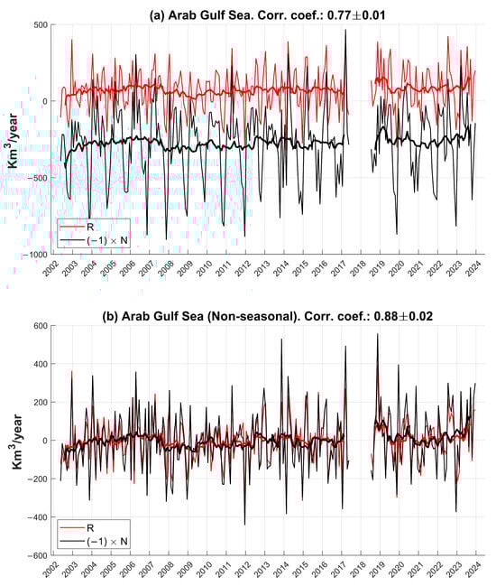 (a) Seasonal and (b) non-seasonal water transport from land to the Arabian Gulf (red curve) and net inflow to the Arabian Gulf (black curve). Black curve represents −N. As N is multiplied by −1, positive (negative) values of the black curve represent above-average (below-average) flows. Correlations between R and N are negative in both cases.