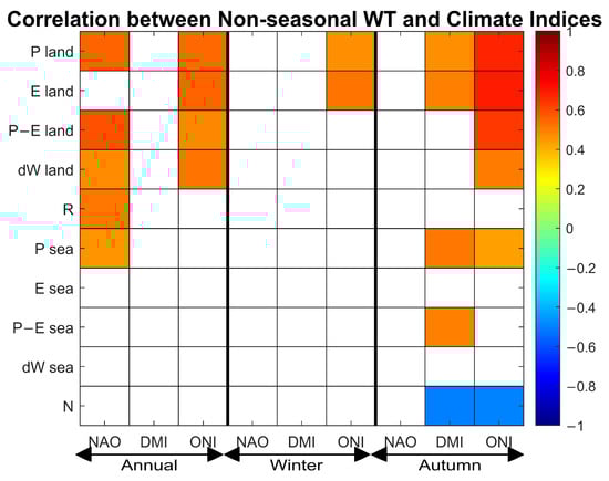 Pearson correlation coefficients between the WT components of the region and the NAO, ENSO, and IOD climate indices. Correlations are estimated for annual, winter, and autumn means. White squares represent correlations that are not statistically significant at the 0.05 significance level.