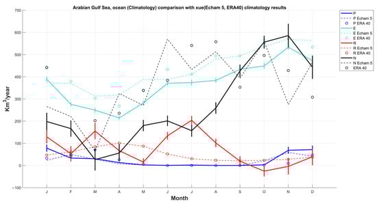Monthly climatology of water transport components in the Arabian Gulf from this study (solid thick lines) and Xue et al. (2015) []. The dashed lines (circles) are estimates using atmospheric data from ECHAM5 (and ERA40 data).