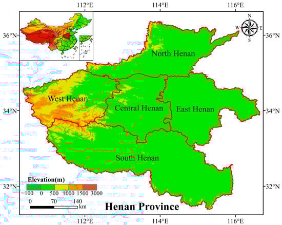 Henan Province (31°23′–36°22′N, 110°21′–116°39′E) primarily lies in the warm temperate zone, while its southern region borders the subtropical zone, belonging to the transition from the north subtropical zone to the warm temperate continental monsoon climate. Over the last decade, Henan Province has experienced average annual temperatures ranging from 12.9 °C to 16.5 °C, precipitation between 464.2 mm and 1193.2 mm, sunshine hours ranging from 1505.9 to 2230.7 h annually, and a frost-free period lasting between 208.7 and 290.2 days (www.henan.gov.cn) (accessed on 25 March 2023). The forest cover ranges from 12.52% to 20.16% (https://d.qianzhan.com/) (accessed on 25 March 2023). As shown in Figure 1, there are 5 regional divisions in Henan Province, including North Henan, South Henan, West Henan, East Henan, and Central Henan.