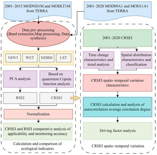 The ecological indicators of CRSEI and RSEI in the research were constructed based on MODIS data products from 2001–2020. The MODIS data products used in the research were obtained from two sources: (1) the Geospatial Data Cloud website from the Computer Network Information Center of the Chinese Academy of Sciences, and (2) the official website of the National Aeronautics and Space Administration (NASA). Since the China Geospatial Data Cloud website lacks MODIS data after 2016, 2001–2015 was selected as the time range to download the synthetic data products. The NDVI and LST for 2016 to 2020, along with other required data for 2001 to 2020, needed to be downloaded from NASA. The sources for research indicators and research data products are shown in Table 1.