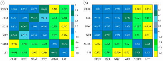 Matrix of correlation coefficients between CRSEI, RSEI and each ecological indicator (NDVI, WET, NDBSI, LST). (a) Annual scale; (b) monthly scale.