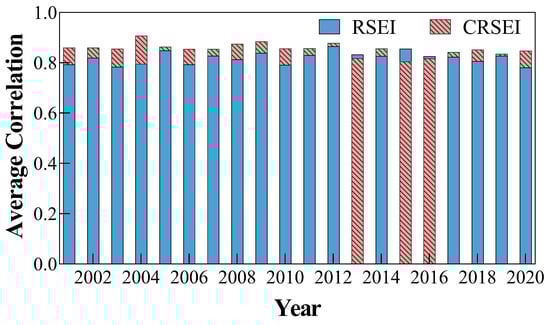 In Figure 4, the average correlation between CRSEI and RSEI exceeded 0.8 in all 20 years from 2001 to 2020. Notably, their average correlation was greater than 0.9 in the years 2001, 2011, and 2020. Specifically, in 17 out of the 20 years, the average correlation of the CRSEI exceeded that of the RSEI, with the exception of 2013, 2015, and 2016, when the average correlation of the CRSEI fell slightly below that of the RSEI. The average correlation of CRSEI was lower than that of RSEI by 0.015, 0.051, and 0.009, respectively.