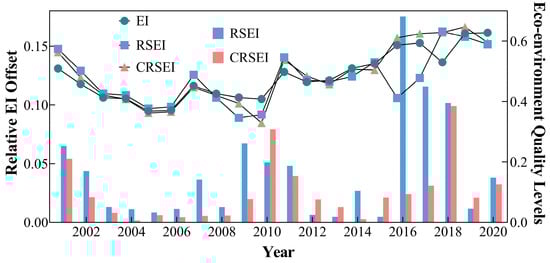 Eco-environment quality levels change and relative EI offsets of CRSEI and RSEI from 2001 to 2020 in Henan Province.