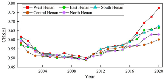 CRSEI variation from 2001 to 2020 in various regional subdivisions of Henan Province.