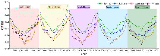 Seasonal CRSEI variation from 2001 to 2020 in various regional subdivisions of Henan Province.