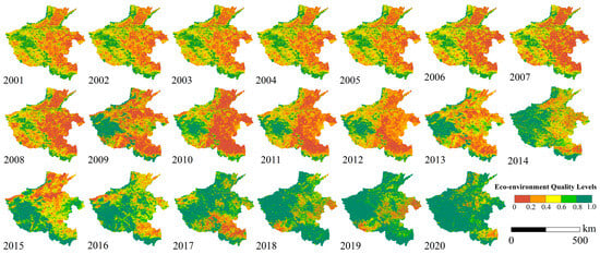 The spatial distribution of CRSEI eco-environment quality levels from 2001 to 2020 in Henan Province.