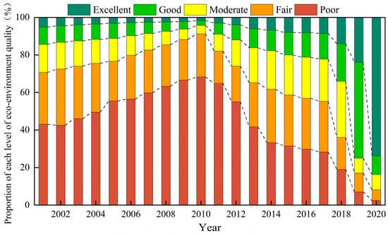 The variation in the proportion of each level of eco-environment quality from 2001 to 2020 in Henan Province.