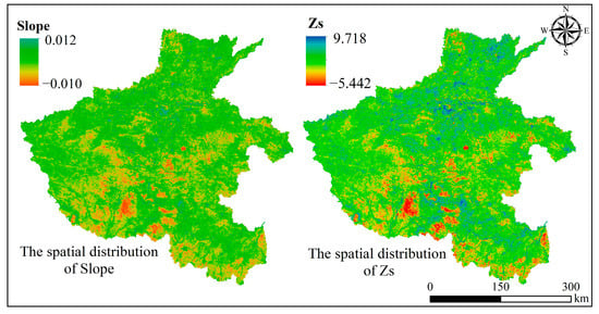 Based on the raster seasonal and annual scale time series of CRSEI in Henan Province from 2001 to 2020, raster images depicting statistics Slope and Zs were generated using Sen + MMK trend analysis to determine spatial trends, as illustrated in Figure 11 and Figure 12. For the period from 2001 to 2020, in most areas of Henan Province, where Slope > 0 and 1.65 < Zs < 1.96, there was an indication of a slightly significant improvement trend in EEQ. Where Slope > 0 and Zs > 1.96, a significant improvement trend in EEQ was indicated, predominantly in the central region of Henan Province. In a few areas, where Slope < 0 and −1.65 < Zs < −1.96, a slight deterioration trend in EEQ was indicated, primarily in the southern region of Henan Province. Seasonally, the overall performance aligned more closely with annual trend changes, with EEQ improvement in Henan Province being more pronounced during spring and summer compared to fall and winter. In the central region of Henan Province, the trend toward EEQ improvement surpassed that in other regions across all four seasons.