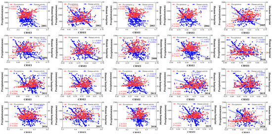 The research conducted random point sampling of CRSEI, human footprints, and precipitation in the study area and used Pearson correlation coefficient to analyze the correlation between intensity of human footprints and precipitation and CRSEI to infer the potential reasons for CRSEI changes.