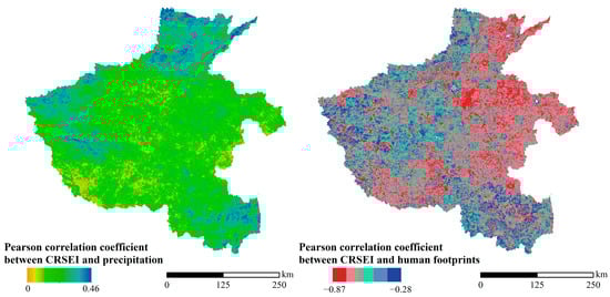 Spatial distribution of CRSEI with human footprint and precipitation correlation coefficients.