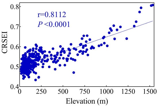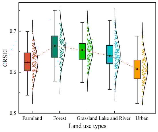 Figure 15 illustrates the correlation between elevation and CRSEI, with a correlation coefficient of r > 0.8, indicating a strong relationship. This suggests that EEQ in Henan Province improves with increasing elevation. Figure 16 presents the distribution of CRSEI across different land use types, showing that forests have the highest CRSEI, followed by grassland, while urban exhibit the lowest CRSEI. This demonstrates that urban expansion negatively impacts EEQ [54].