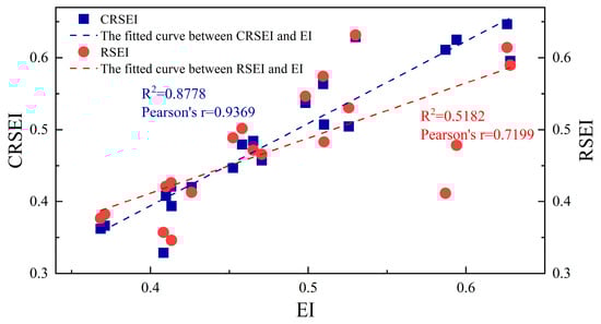 R2 and correlation coefficient of EI with CRSEI and RSEI.